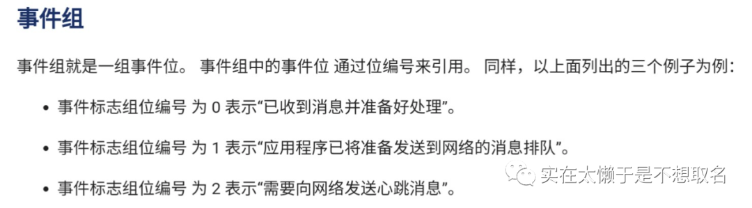 虽然使用二进制信号量可以很好的实现标志位的实现以及相应的任务安排,但是二进制信号量并不适用于大量的标志位。因为一个二进制信号量只能表示一个事件,假如我们的程序有大量的事件那有没有办法不用二进制信号量可以很好的管理这些事件呢?
