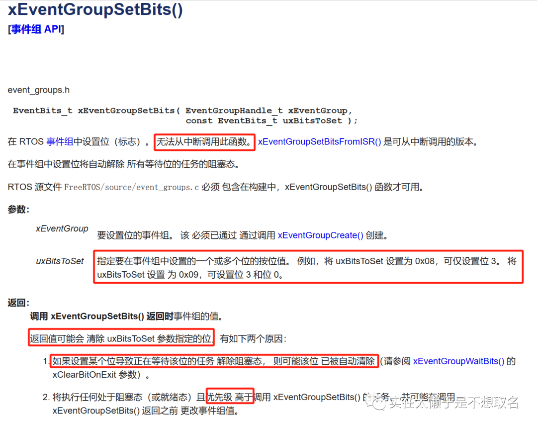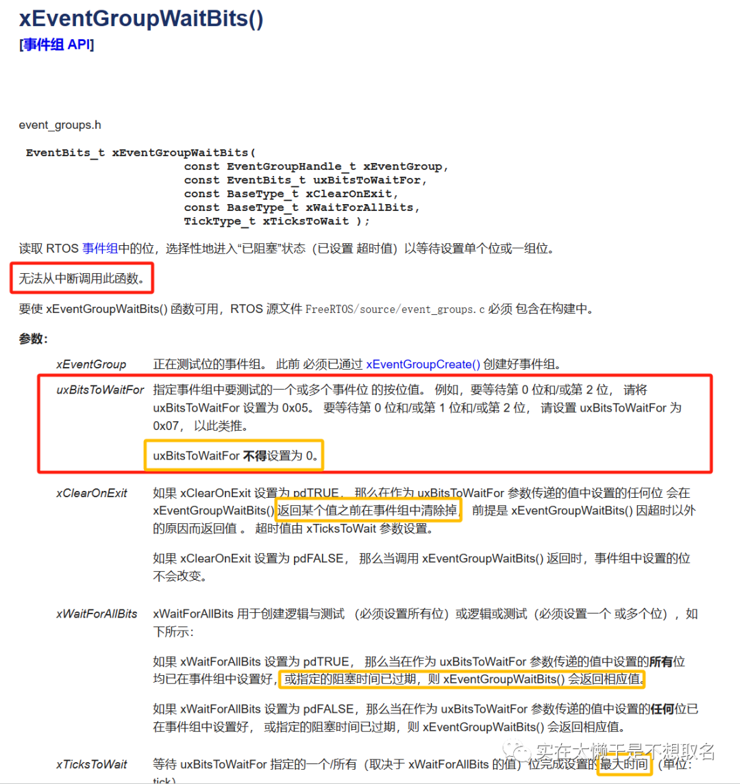 等待事件组的函数和信号量相似,设置我们需要等待事件发生的位并且设置超时时间。但是注意的是我们选择需要等待的位不能设置为0
