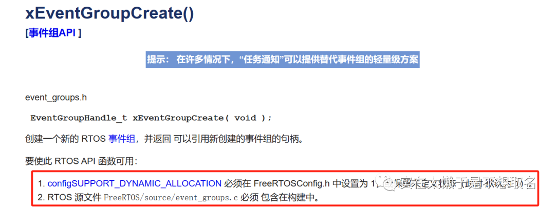 事件组的创建函数 非常简单,只需要定义一个事件组的句柄来接收事件组创建函数的返回值即可。事件组的长度前面说过利用宏定义来确定时间组长度。
