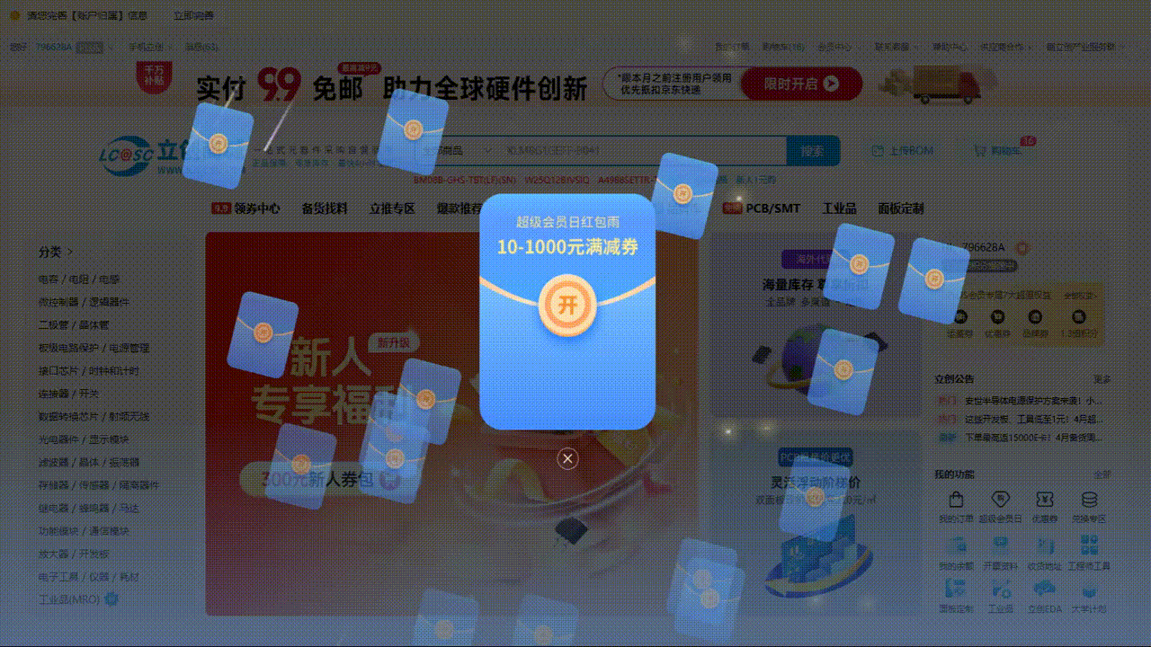 再也不用担心物料清单超预算了!7月2-4日登录立创商城即可参与超级红包雨活动,随机掉落10~1000元优惠券,最高立减1000元!