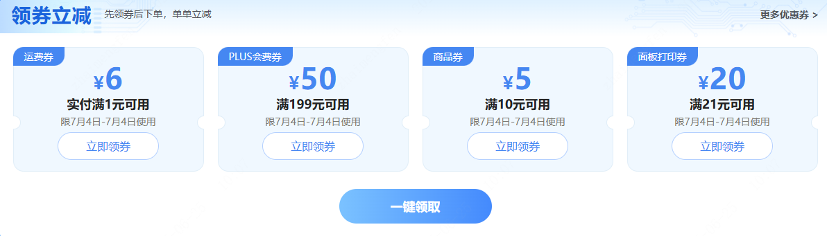此外即日起-7月4日,还可以领运费券、PLUS会费券、工业品券、专属品牌券等!