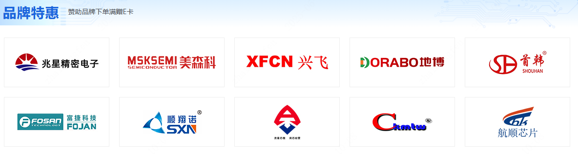 另外当天购买兆星、美森科、兴飞、地博、首韩、富捷、顺翔诺、灵星芯微、灿科盟、航顺品牌商品累计单笔订单每满1000元送50元E卡多品牌最高叠加赠1500元E卡!