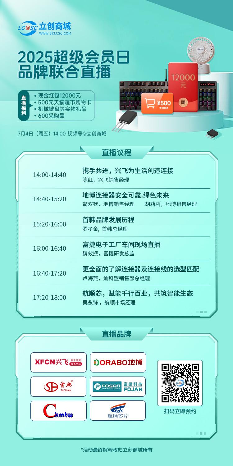7月4日14点开始,2025年7月超级会员日品牌联合直播来袭!兴飞、地博、首韩、富捷、灿科盟、航顺品牌的嘉宾将轮番上场讲解,将在立创直播间和大家梦幻联动,还将送出多种惊喜好礼!