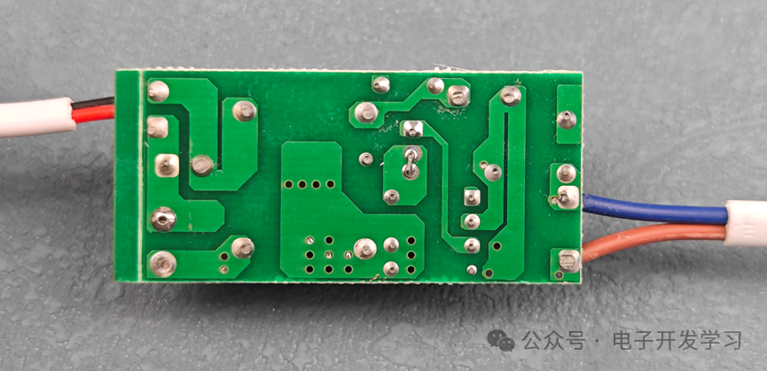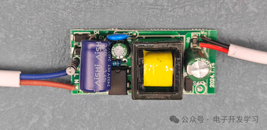 整体看一下,这个台灯的拓扑相当简单。电源线进来之后,一根经过自锁开关接到板子的L端,另一根线直接接到板子的N端。板子的输出线接到了台灯的灯板,就是这么简单粗暴。