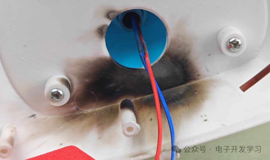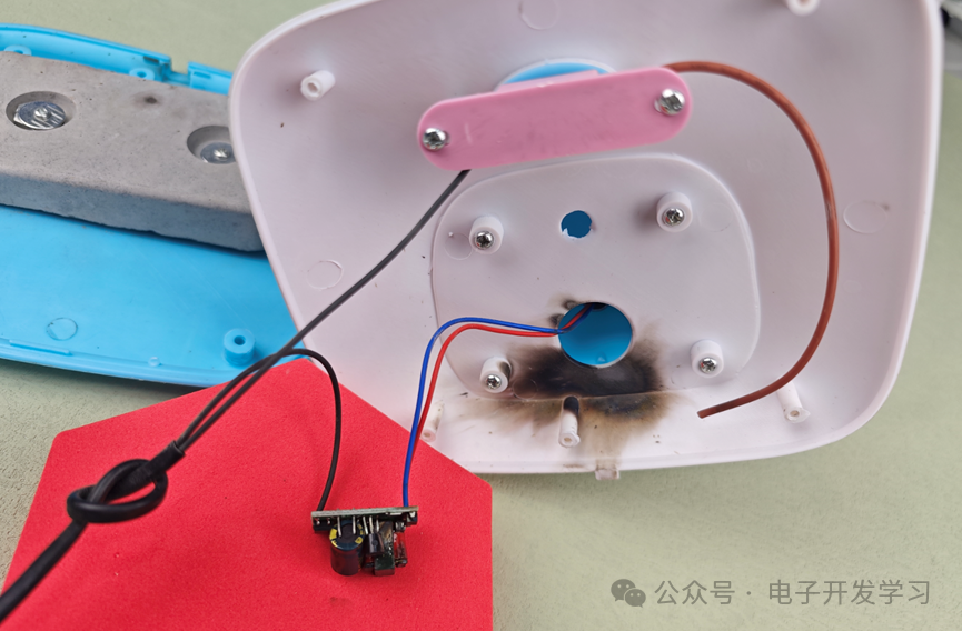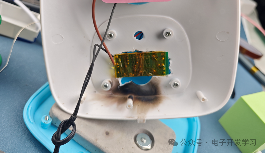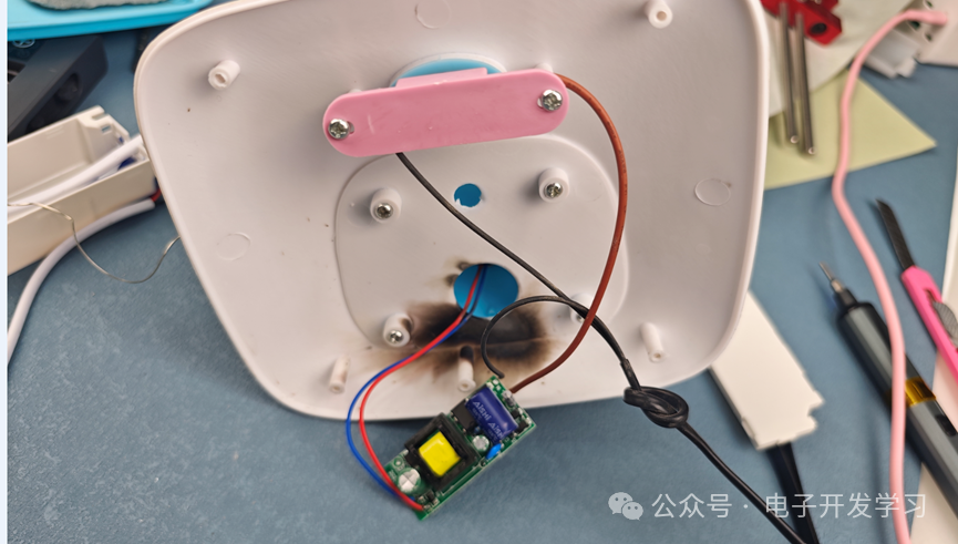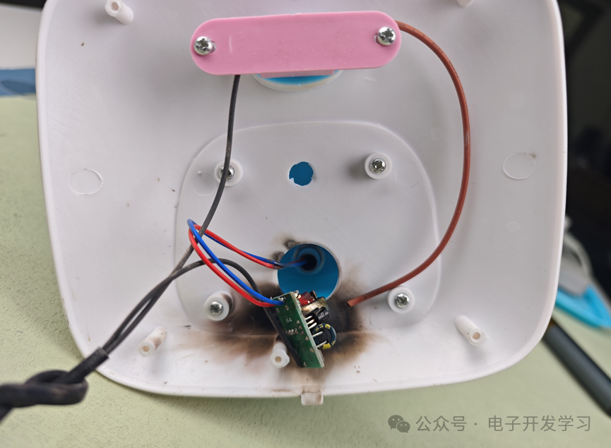 由于新换的板子尺寸太大,而且厚度比之前的厚,原来放电路板的位置放不下了,只好在底座上掏了一个洞,然后把板子卡进去。把板子卡进去之前,先用耐高温胶带把板子包了一下。然后把底座和灯罩什么的安装回去。