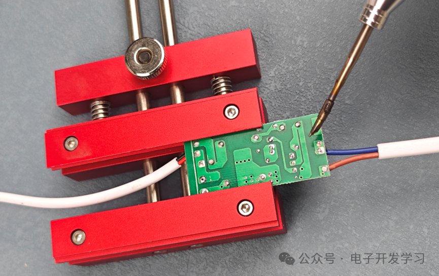 拿出赤焰红色的焊接夹具,把板子夹住,然后使用i210便携烙铁拆掉上面的线。