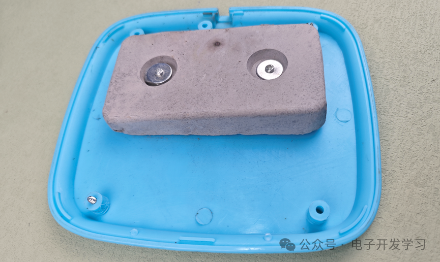 拆了底座发现底下安装了一个水泥块,这个是为了增加配重的,这个办法不错,成本低,效果好。