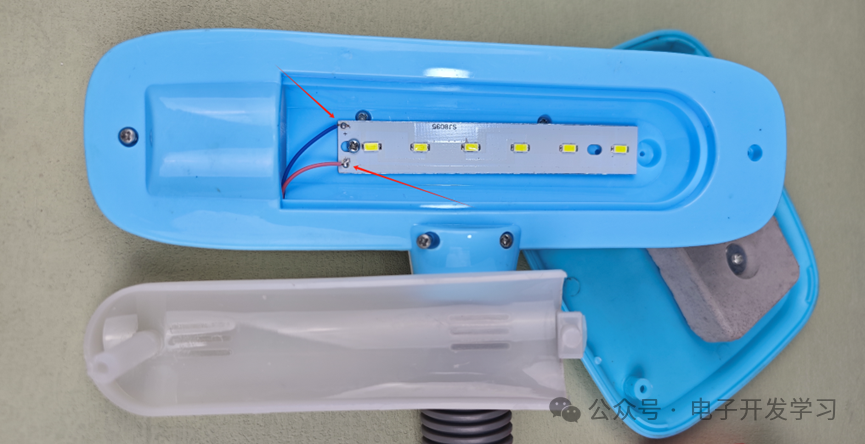 打开灯罩可以看到灯板上有六个灯珠,这六个灯珠三串两并。