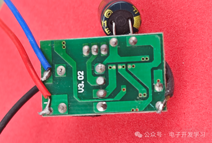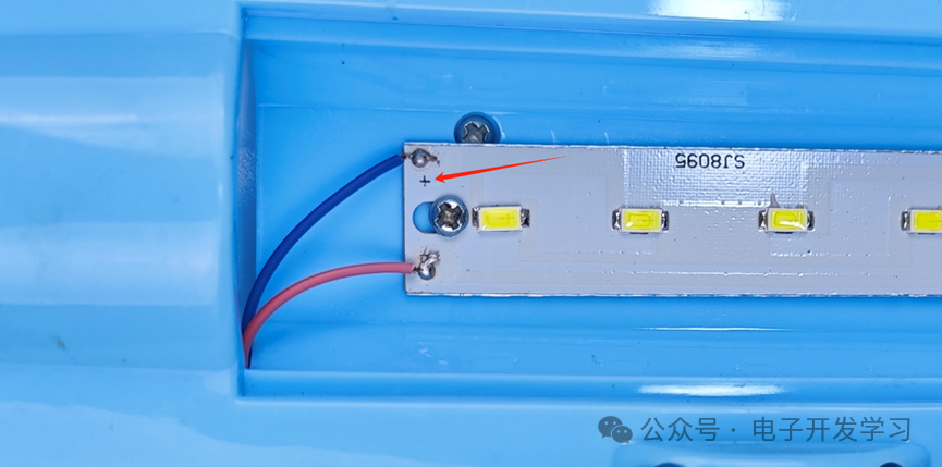 检查了一下,悲催的发现,我把LED灯板的正负极焊接反了。我按照常规,以为红色的是正极线,蓝色是负极线,看了一下灯板才发现,他们是反着焊的。赶紧扒掉电源线,稍等一会儿电容的电放完之后,拆掉线重新焊接。再上电测试,灯果然亮了。