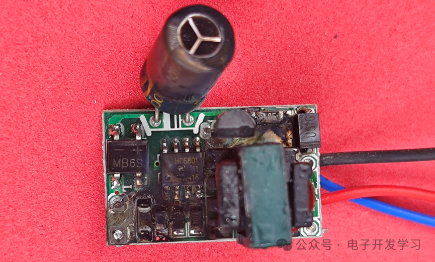 看起来炸的相当彻底,丝印HC6801这个芯片中间炸了一个坑,电路板右上角也烧的很糊。
