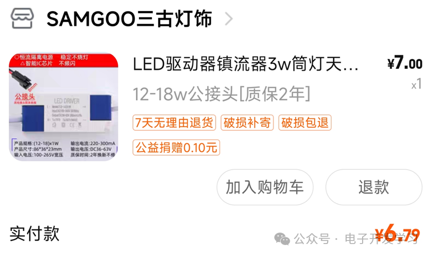 于是我去某宝花了不到7块钱,买了一个LED驱动模块。