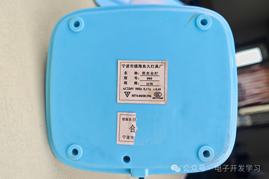 底座下面的铭牌贴纸还在,看规格,这个台灯的功率是11W。没看出来出厂日期什么的,所以也就不好确定它的年龄。