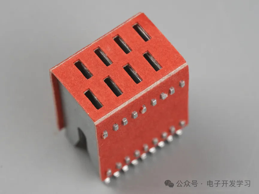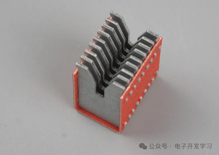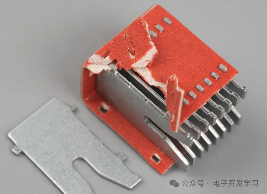 这个灭弧装置也没有固定在壳里,轻轻一拿就出来了,仔细观察,发现这个件上面的这些金属片之间也没有电气连接,纯纯是通过这个“红色纸片”固定的。