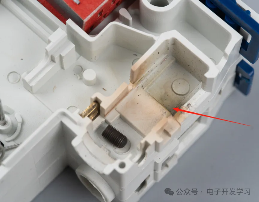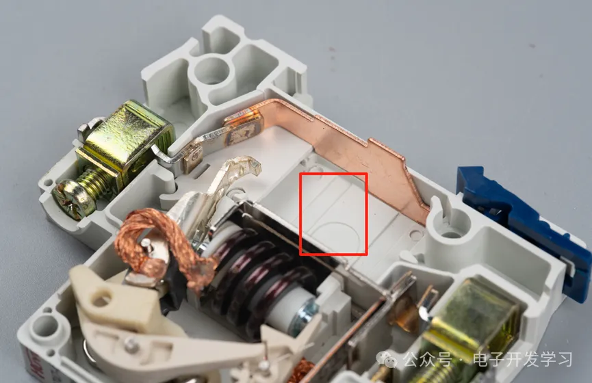 拆解之后,可以清晰地看到内部结构。原来这万一就像一个大型继电器。当你用手把开关推上去之后,整个用电回路导通,其中电流要流过中间这个紫黑色的弹簧线圈,而过流之后,这个弹簧线圈就会产生一个磁力,在磁力作用下,触点断开,切断供电。