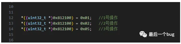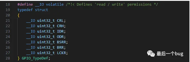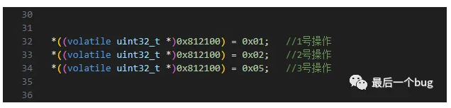从前面对volatile的功能描述,我们可以知道volatile最常用于那些与硬件外设寄存器打交道的地址,这样确保每次对寄存器的读取都是从内存中获取的最新值,比如: