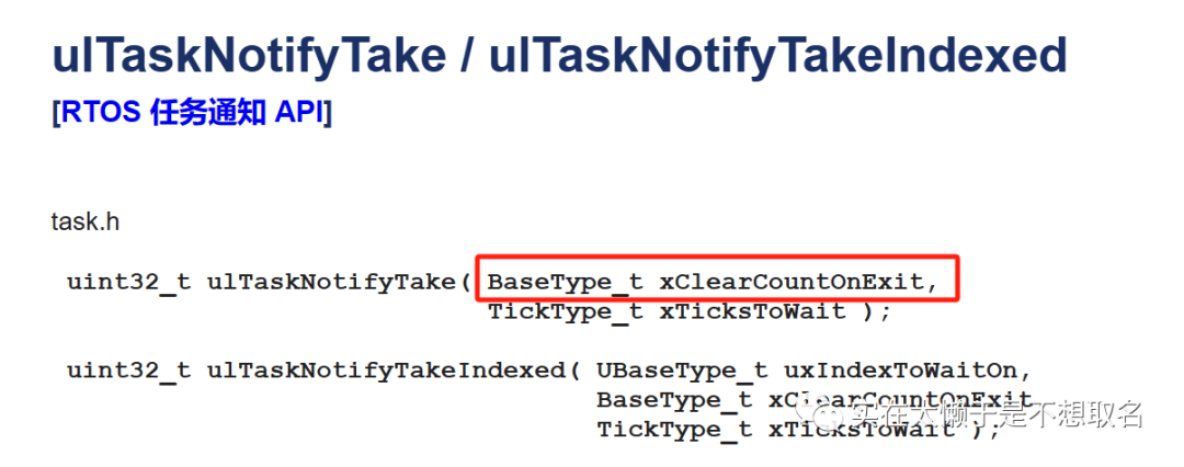 在ulTaskNotifyTake()中需要注意的是,我们需要设置一个参数用来确定我们模拟的是二进制信号量还是计数信号量。