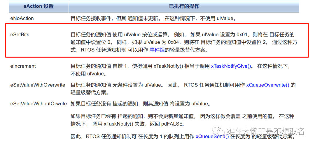 我们可以修改xTaskNotify中的eAction来将通知值作为事件组,修改特定位来实现事件位的效果。