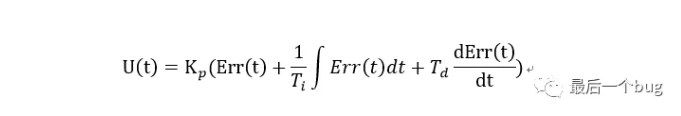 PID算法主要就是三项,比例(P)-积分(I)-微分(D),在连续的时间域内的表达式如下: