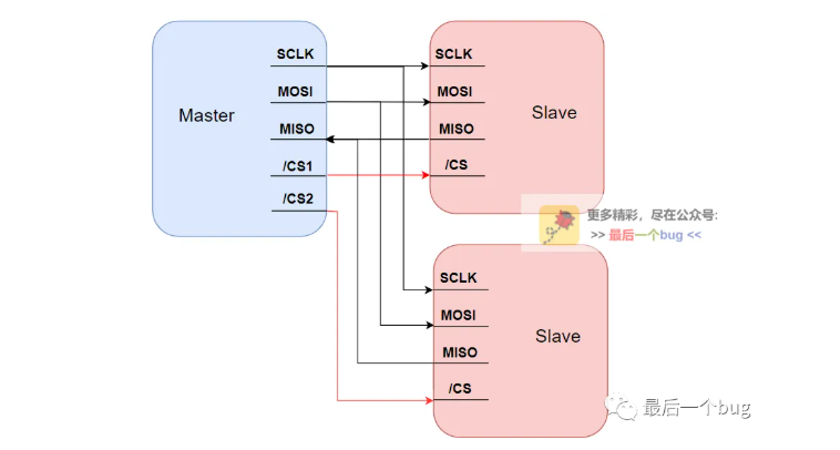 SPI是一种主从通信方式,在SPI通信总线上通常只有一个主机,一切通信的开始都是以主机发起,那如果在一条总线上与多个从设备通信呢?下面以两个从机为例,更多的从机也是类似的。