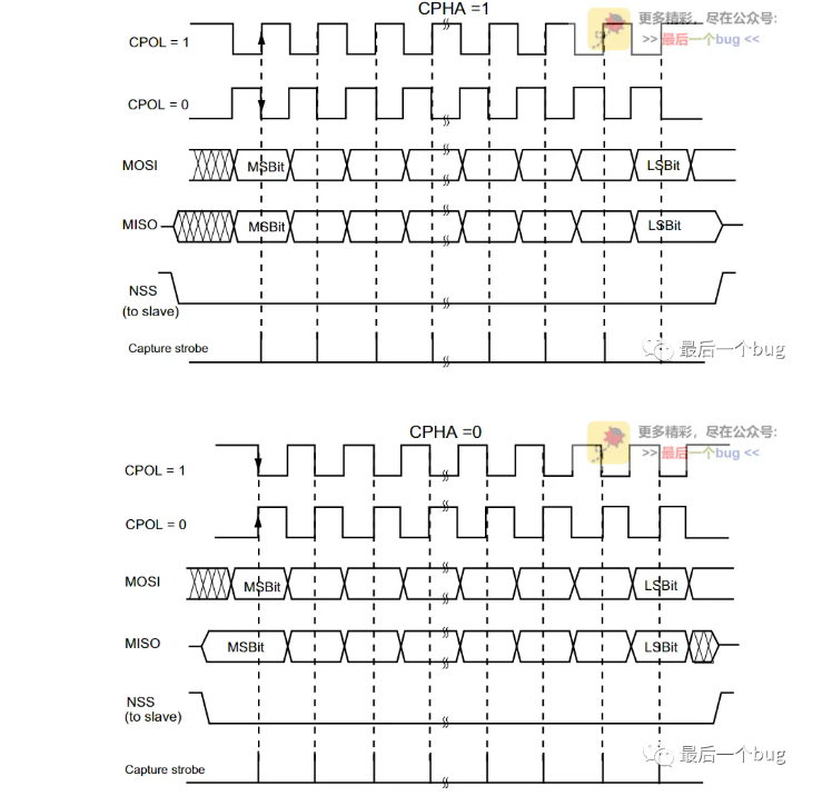 3、CPHA决定了数据在第几个跳变沿采集,当CPHA=0,在SCLK第一个跳变沿采集稳定数据;当CPHA=1,在SCLK第二个跳变沿采集稳定数据。