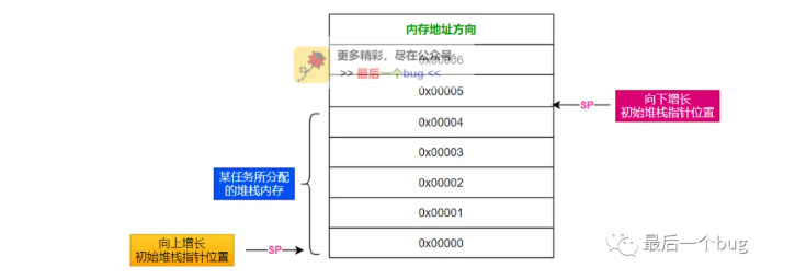 RTOS在任务初始化的时候,其堆栈指针应该指向其栈底位置,那么对于堆栈向上增长,任务初始化的时候我们需要把堆栈指针设置在所分配内存的低地址内存处,反之则设置到高地址处。