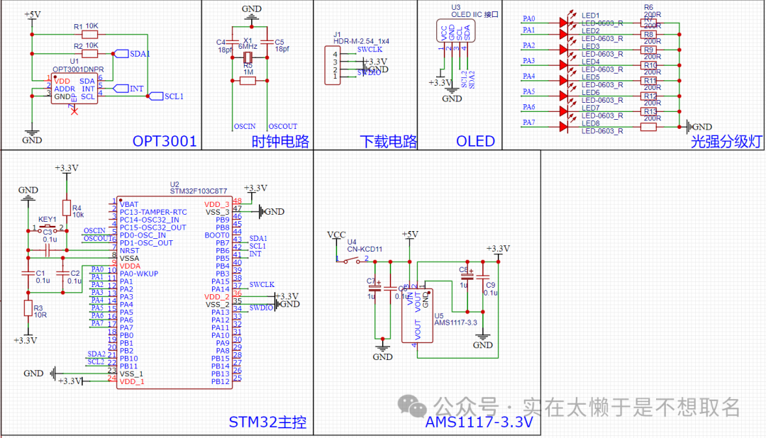 显示电路方面本来是想使用数码管的,因为觉得数码管的显示大一点,不过实在觉得数码管的显示太复古了,最后还是决定使用OLED,而价格方面由于测量范围是0.01LUX~83000LUX,那么其有效位数就是7位,需要两个四位数码管,虽然引脚完全足够,但是个人购买的话,数码管的价格是4元多,而OLED的单价在八元多,并且OLED可以自定义的内容可以多很多,因此还是选择0.96寸OLED。
