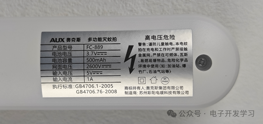 看了一下手柄背面的铭牌,型号是FC-889,电池电压3.7V,网面电压2600V。右侧有高电压危险标识。