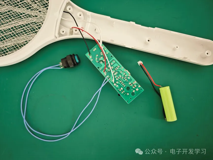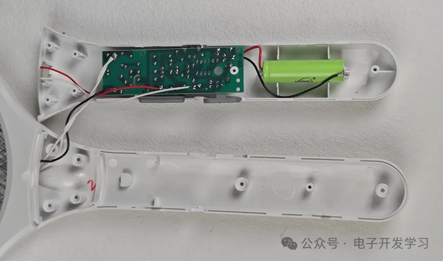 这电蚊拍拆解简直不要太简单,手柄上7个螺丝拆掉之后,就可以打开了。看到内部还是挺简单的,一个锂电池,一个电路板。锂电池是14500的尺寸,和AA电池,也就是5号电池一样大。