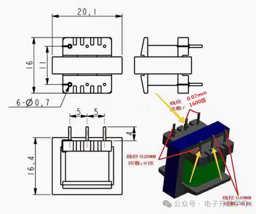这个变压器有三个绕组,在网上找到电蚊拍专用的三绕组变压器大概是这样的。三个绕组的匝数分别是9匝,35匝,1600匝。