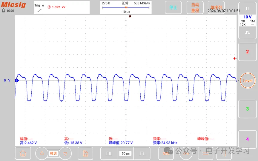 使用低压探头看三极管基极电压,波形如图。这就是通过三极管和变压器配合实现把3V直流转化为交流电压的核心。这部分波形为开关按下之后的波形。