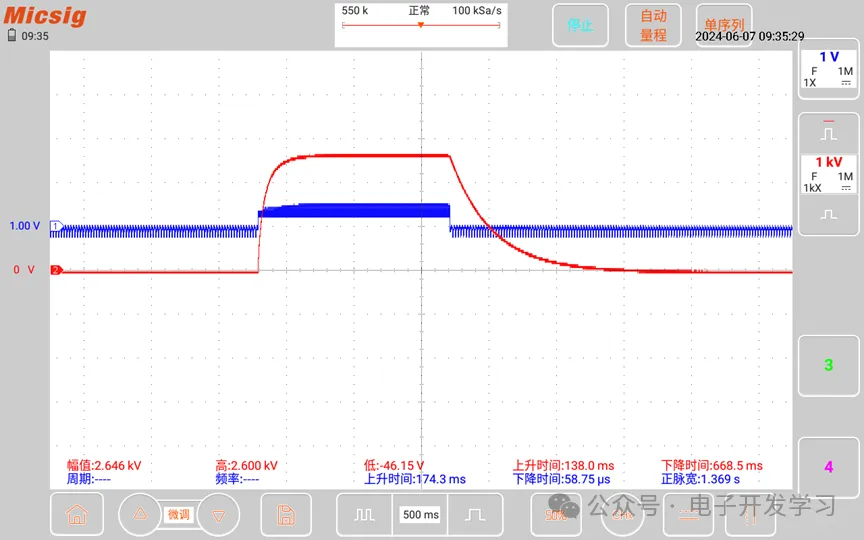 再通过倍压电路升压到2.6V。这部分波形为开关未按下、按下、松开整个过程的波形。说明:在右侧通道2的上面有一条红线,这是通道设置反相的标志。