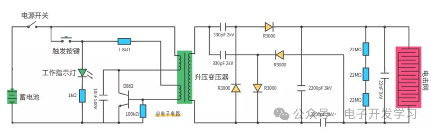 我在网上找了一下,发现关于电蚊拍的电路有比较详细的讲解(图片来自面包板论坛帖子:由电蚊拍,学电路。(振荡、整流、高压泄放))。这个图和我拆的这个电蚊拍的电路基本上没啥差别。而且这篇文章中有对震荡电路和变压器升压电路,以及后面的二次倍压整流电路都有详细的讲解。
