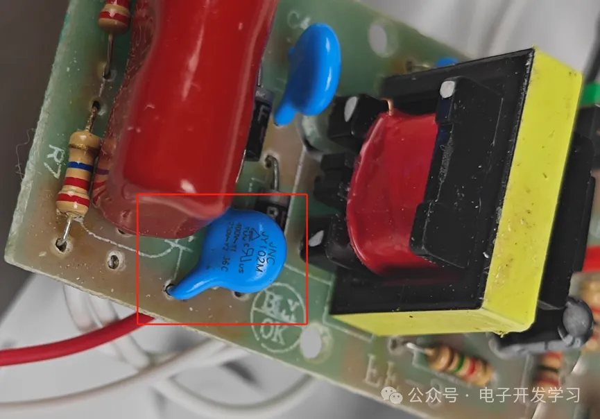 CBB电容和变压器中间还有两个这种蓝色的电容。这是Y2安规电容,102是指容值为1nF。