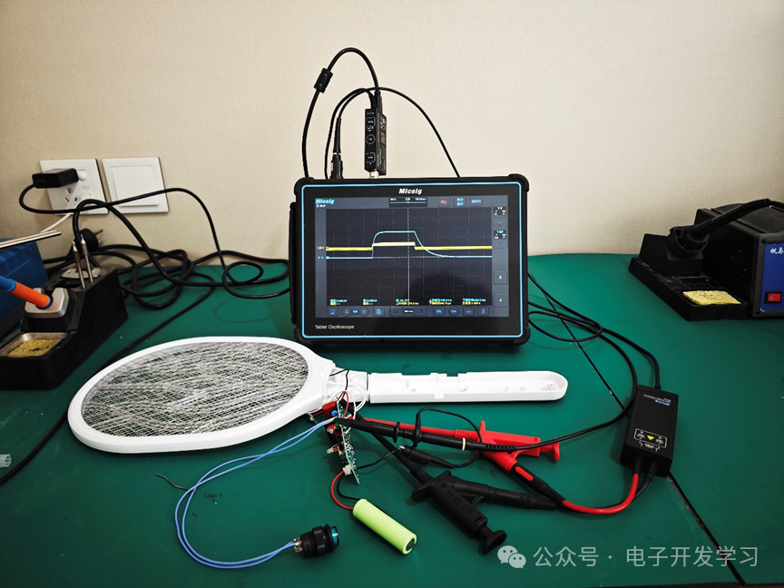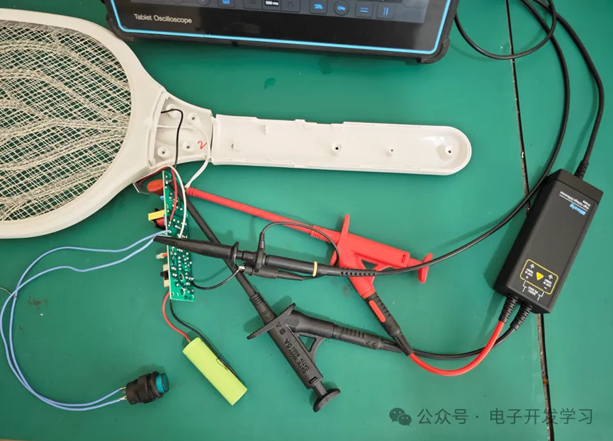 用3KV高压差分探头夹在电击网引线两端,用普通探头检测按键输出电压。