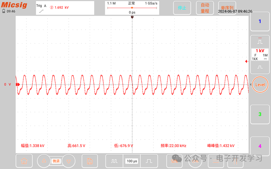 直流电转换为交流电之后,通过变压器升压到峰峰值1.432KV。这部分波形为开关按下之后的波形。