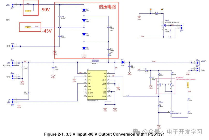 这是使用TPS61391产生-45V和-90V电压的电路,图片来自ti应用手册slvaeh5.pdf。在测量电蚊拍的电击网电压时,我发现产生的直流2.6KV高压也是负压,我在示波器上为了方便观看对通道做了反相,所以在前面的测试波形中看起来是正电压。