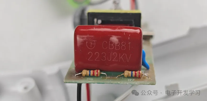 在接高压网这边有一个高压CBB电容,CBB电容就是聚丙烯电容,电压可以做到比较高,当然体积也比较大。下面的223J2KV中223是指容值为22*10的三次方pF,也就是22nF,后面的2KV指耐压为2000V。那就有点不对了啊,铭牌里写的网面电压是2600V啊。一定是我眼花了看错了。