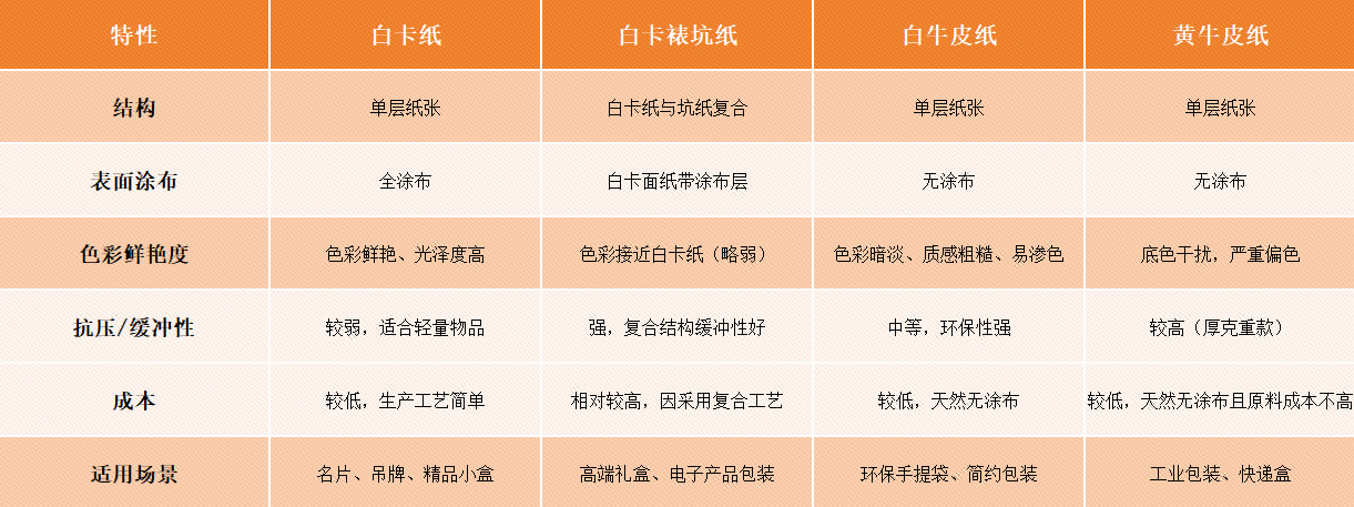 白卡裱坑纸:外层为白卡纸(经涂布处理,表面光滑),属于复合结构,先将坑纸制成瓦楞状,再通过胶水将白卡纸粘贴在坑纸的表面,形成“面纸 + 瓦楞芯纸” 的结构。由于白卡纸表面经过特殊处理,印刷时能够有效阻止油墨渗透扩散,色彩还原度高,能够呈现出鲜艳明亮、细腻有光泽的视觉效果,与白卡纸的印刷效果类似。