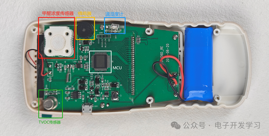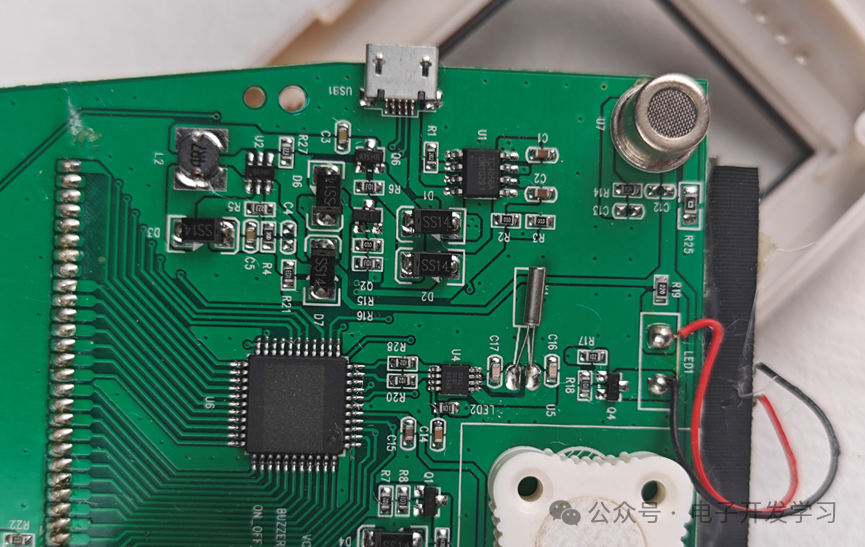 这个测试仪可以测甲醛浓度,可以测温湿度,可以测室内有机气态物质(TVOC),总的来说还是很强。中间这个LQFP-48封装的芯片,丝印被激光打掉了,这个芯片完成了传感器数据采集处理,而且还要驱动这个彩色段码液晶屏。