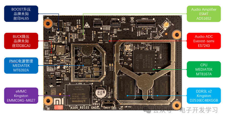 使用的CPU是MEDIATEK的MT8167A,所以PMIC也顺其自然用的是配套的MT6392A。eMMC和DDR3L都来自Kingston。音频功放用的是ESMT的AD51652,音频ADC用的是ES7243。