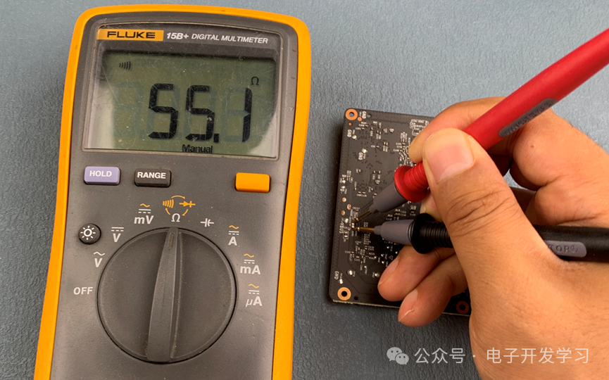 用万用表通断档测试一下,阻值是55Ω左右。这样的话,USB 5V电进来之后,电流大约0.1A,这个器件上热功率是0.5W。这样一个0603封装的器件,热功率0.5W,所以温度上升到99℃也就不稀奇了。
