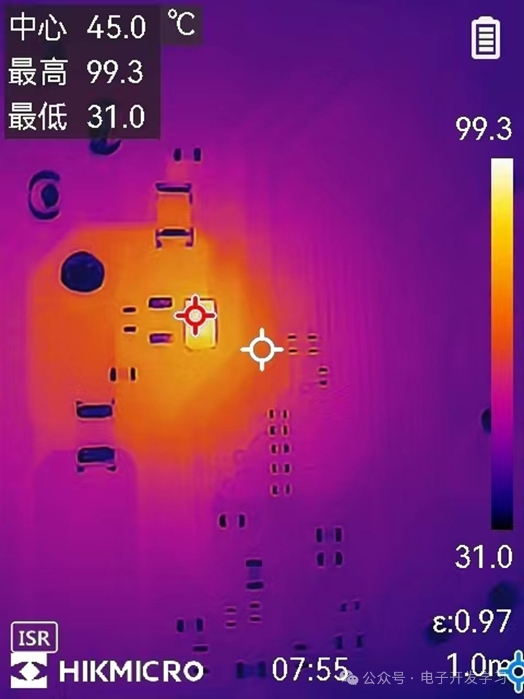 这个器件的温度达到了99.3℃。幸亏没有用手摸,不然这会儿可以吃硅烤猪蹄了。
