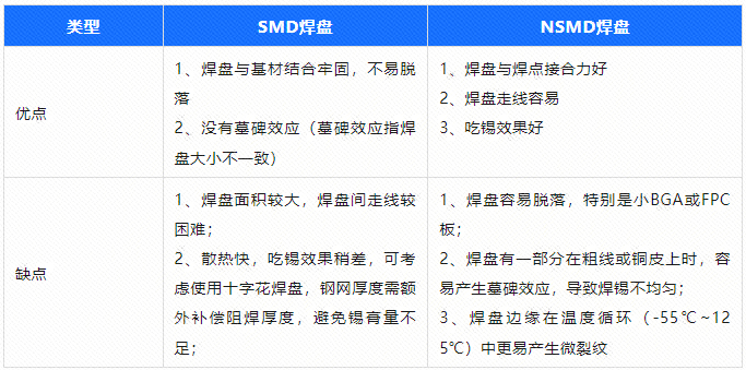 1)PCB优先使用NSMD焊盘,但BGA及微小焊盘,如小于0201封装,建议使用SMD焊盘,防止返修时焊盘与基材剥离脱落。