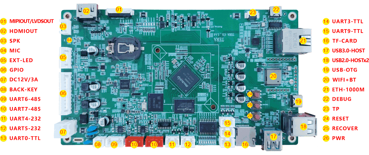 • RK3566 安卓智能主板,采用瑞芯微 RK3566 Cortex-A55 四核 64 位芯片方案,Mali-G52- 2EE GPU ,支持谷歌 Android11 系统,支持主流音视频格式和图片的解码。支持 4K、H.265 硬解码,多路视频输出和输入,嵌入式 3D GPU 使 RK3566 完全兼容 OpenGL ES 1.1/2.0/3.2、OpenCL 2.0 和Vulkan 1.1。特殊的 2D 硬件引擎将最大化显示性能并提供非常顺畅的操作,内置的NPU(1T)支持INT8/INT16/FP16/BFP16 混合操作性能更强,速度更快,接口更丰富。
