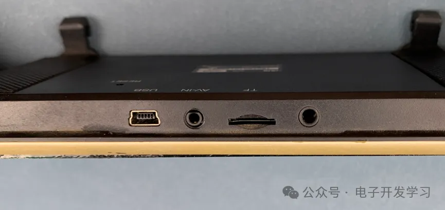 上边缘是Mini-USB接口,一般用这个来供电。另外就是3.5mm麦克风输入接口被用作后置摄像头输入接口,TF卡插槽。