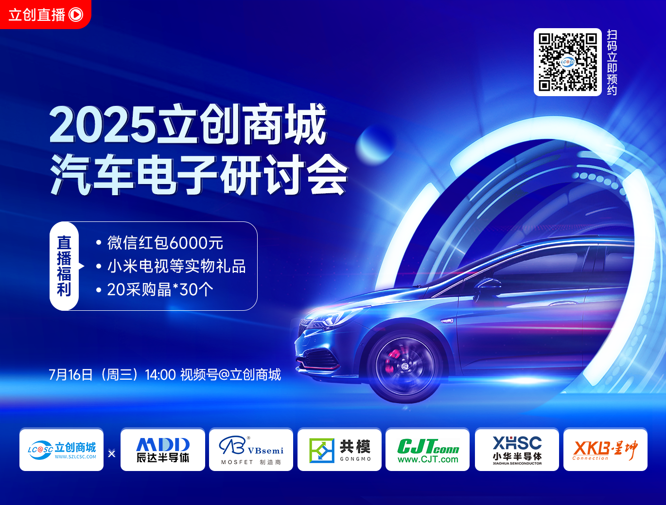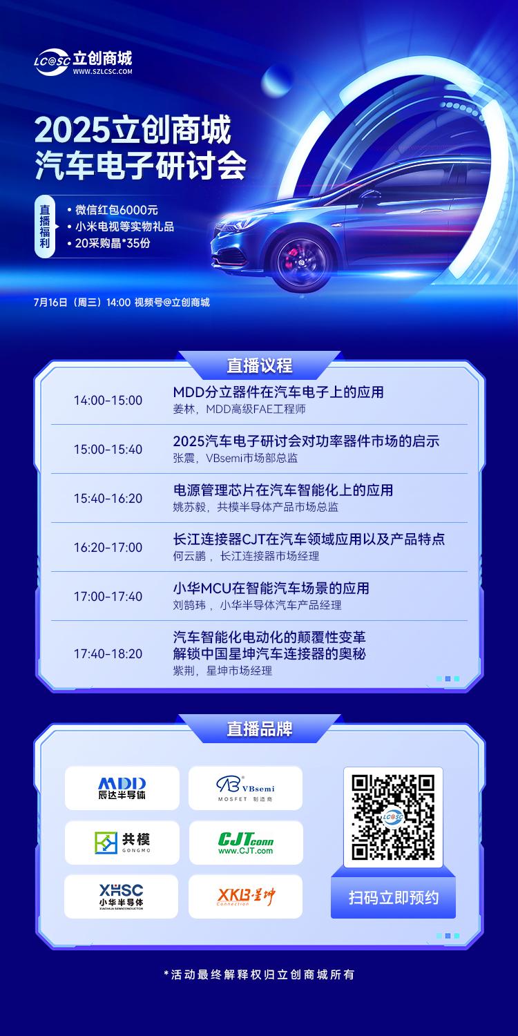 为了解答这些问题,并深入探讨汽车电子行业在智能化浪潮下的发展趋势、技术创新与市场机遇,在7月16日(周三)14点,立创商城将发起「2025汽车电子研讨会」,邀请六大品牌厂商空降直播间,围绕汽车电子行业的实际应用场景,揭秘更多干货内容。
