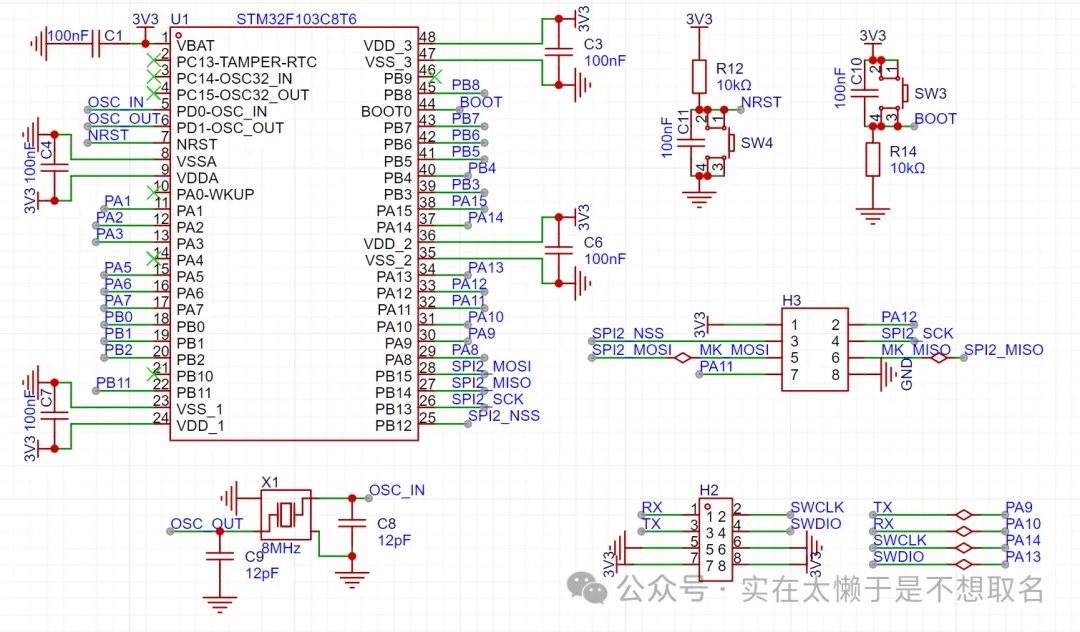 首先是主控设计,仍旧是采用STM32F103作为主控,外接一组硬件SPI用来控制nRF24L01无线模块。