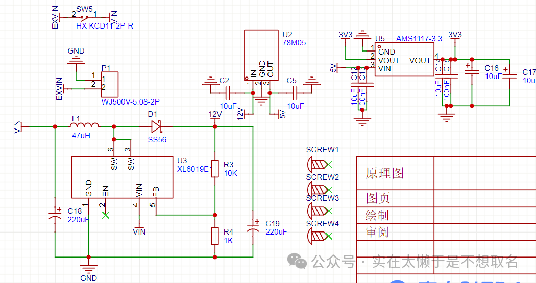 最后就是电源部分,7805的作用是防止1117有过大的压差导致不工作,所以先降压到5V,再进一步降压到3.3V。