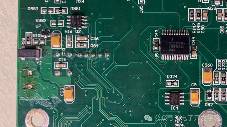 右边的U5是MCZ33993来自飞思卡尔,这是一个多路开关,也可以当做22对1的模拟多路复用器。右下角的IC4型号是REF02AU,这是一个参考电压源。