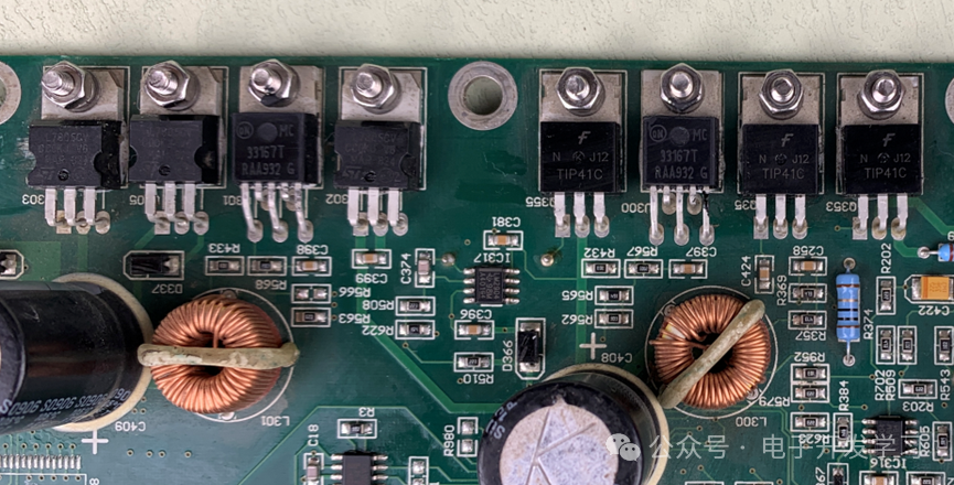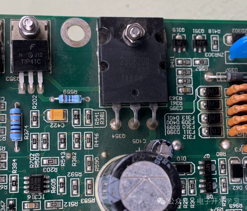 这颗封装巨大的三极管,型号是2SC5200,来自东芝,是一个电流15A,耐压230V的NPN三极管。